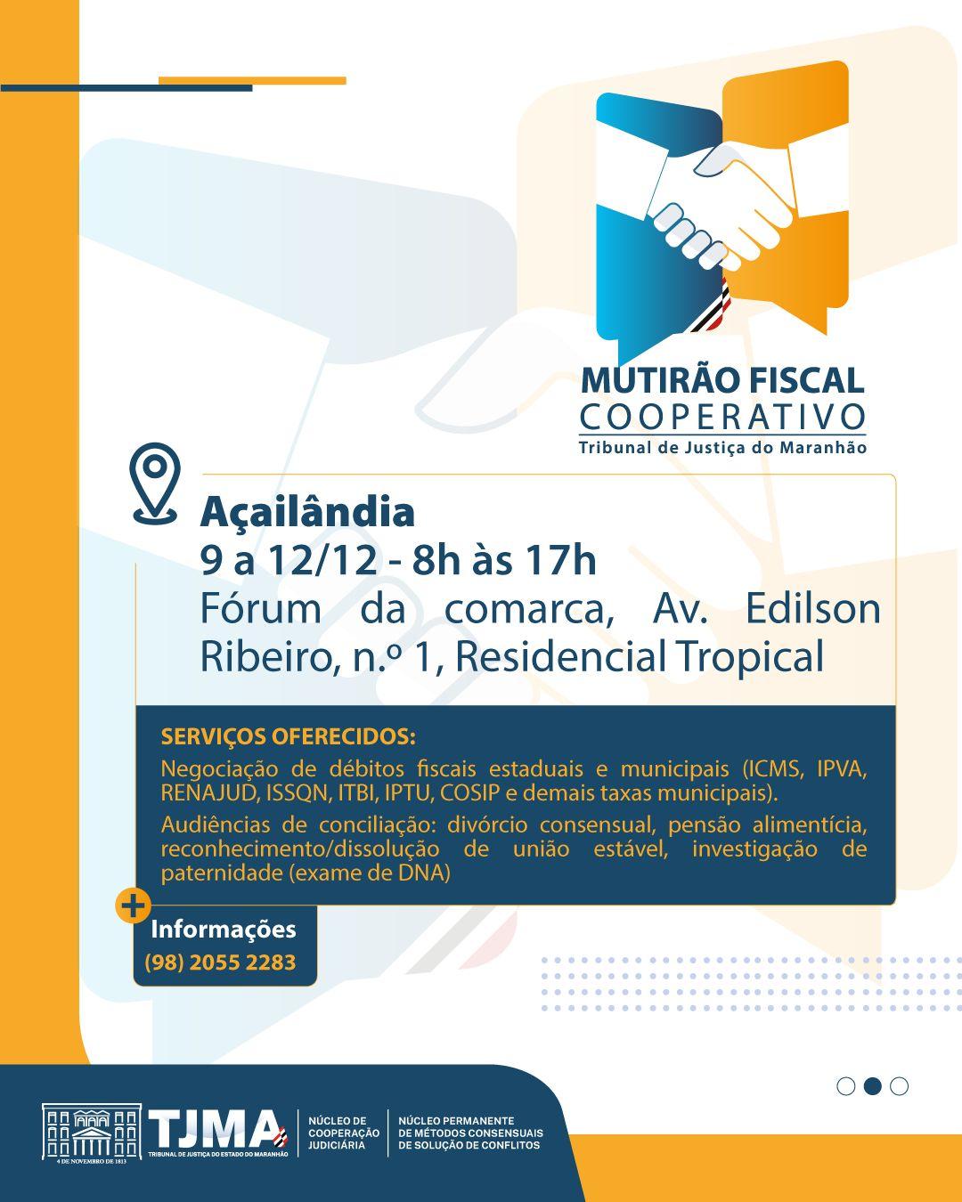 Entre os dias 9 e 12 de dezembro, o município de Açailândia receberá o Mutirão Fiscal Cooperativo, uma iniciativa promovida pelo Tribunal de Justiça do Maranhão (TJMA) em parceria com a Prefeitura de Açailândia e com o apoio do Centro Empresarial de Açailândia (ACIA, CDL e SICA). A ação integra o calendário anual do Judiciário maranhense voltado para o incentivo à resolução de conflitos e à regularização fiscal da população.